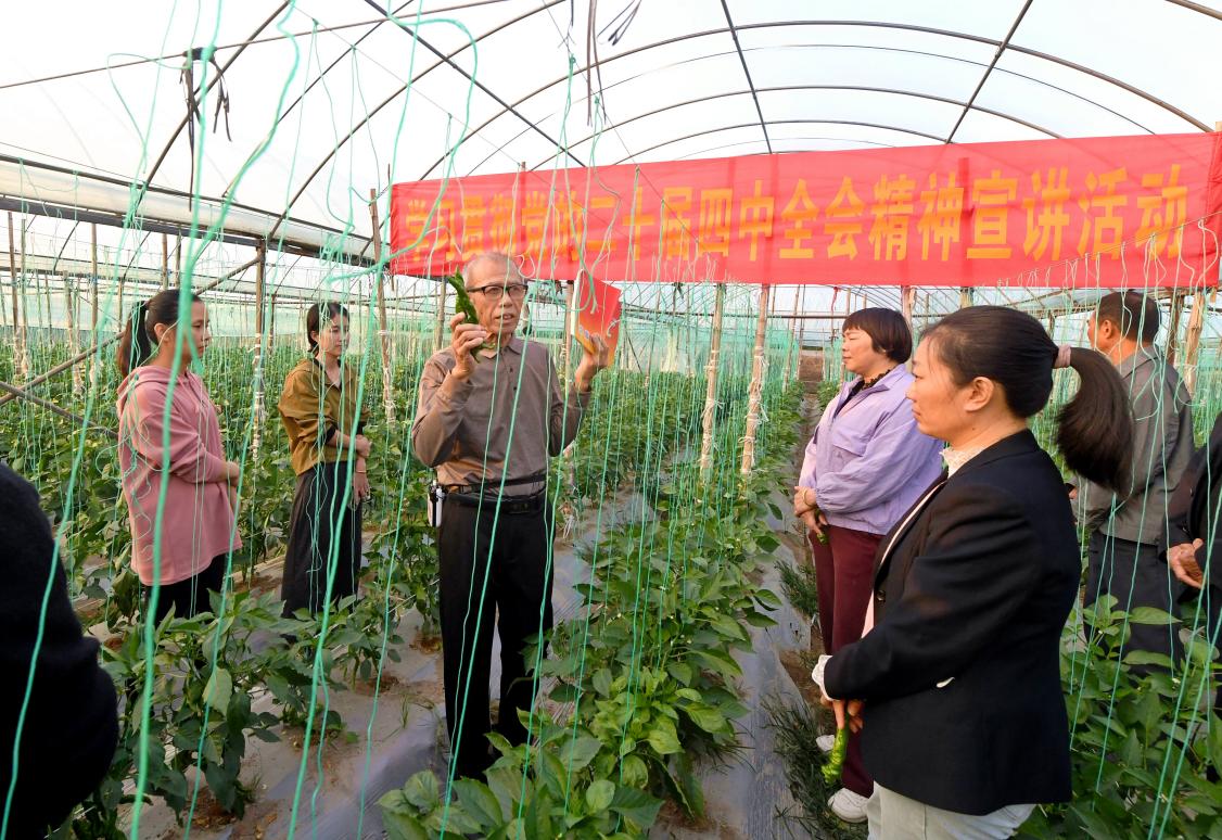 在蔬菜大棚里,镇红色宣传“银燕宣传团”张庆辉将“十五五”规划和基地实际结合起来宣讲“四个”精神中共二十届中央全会致村干部和原联谊会成员。 (陈嘉伟 摄)